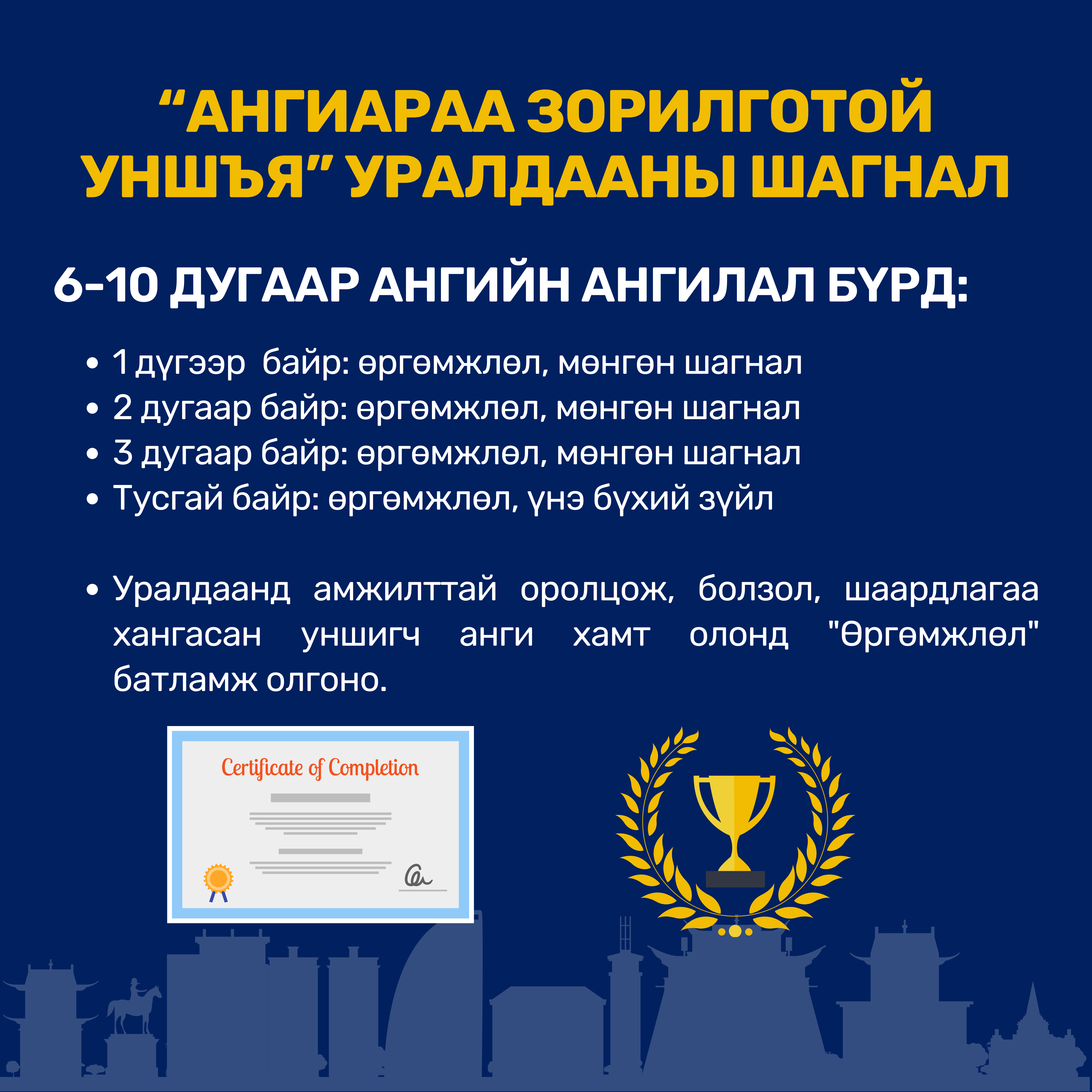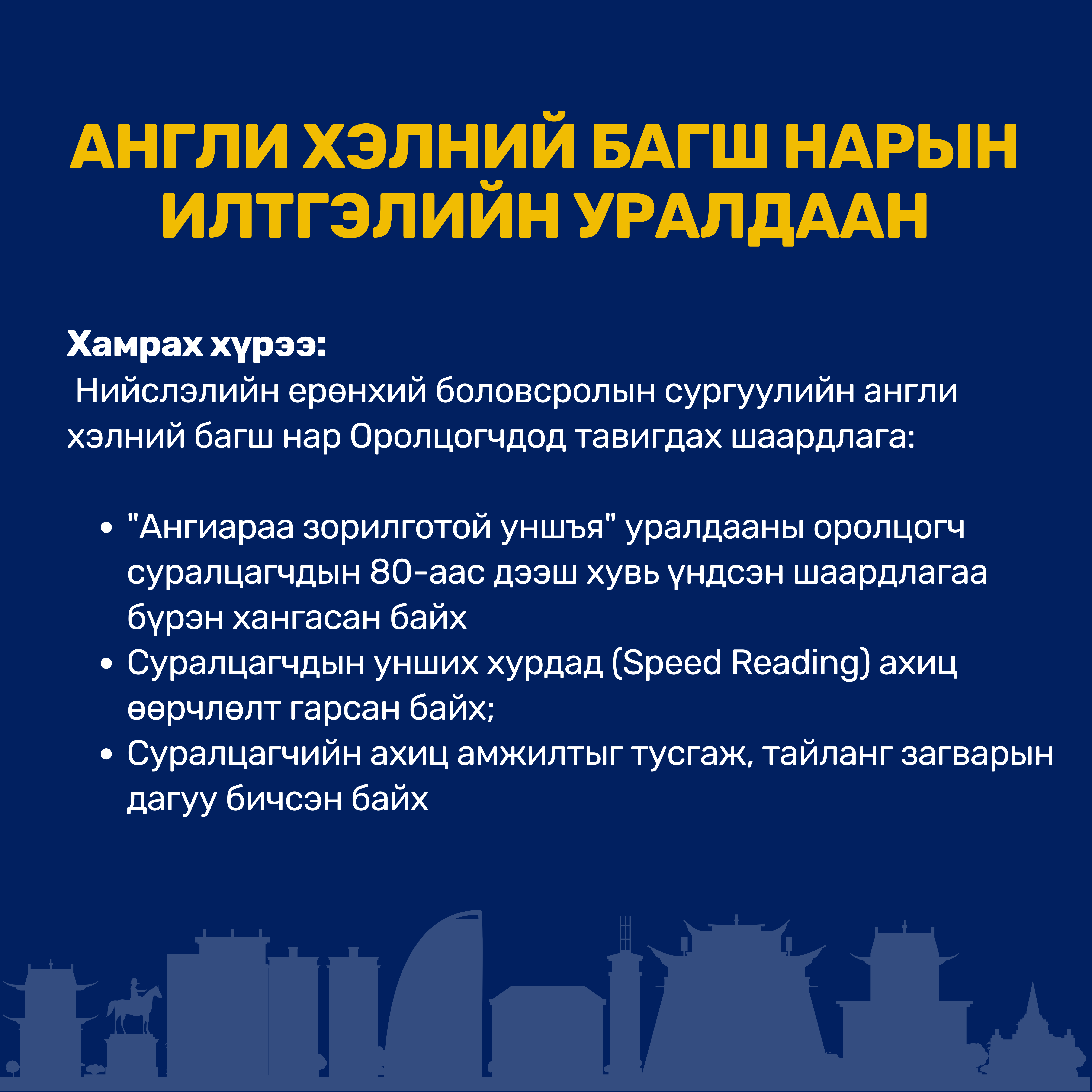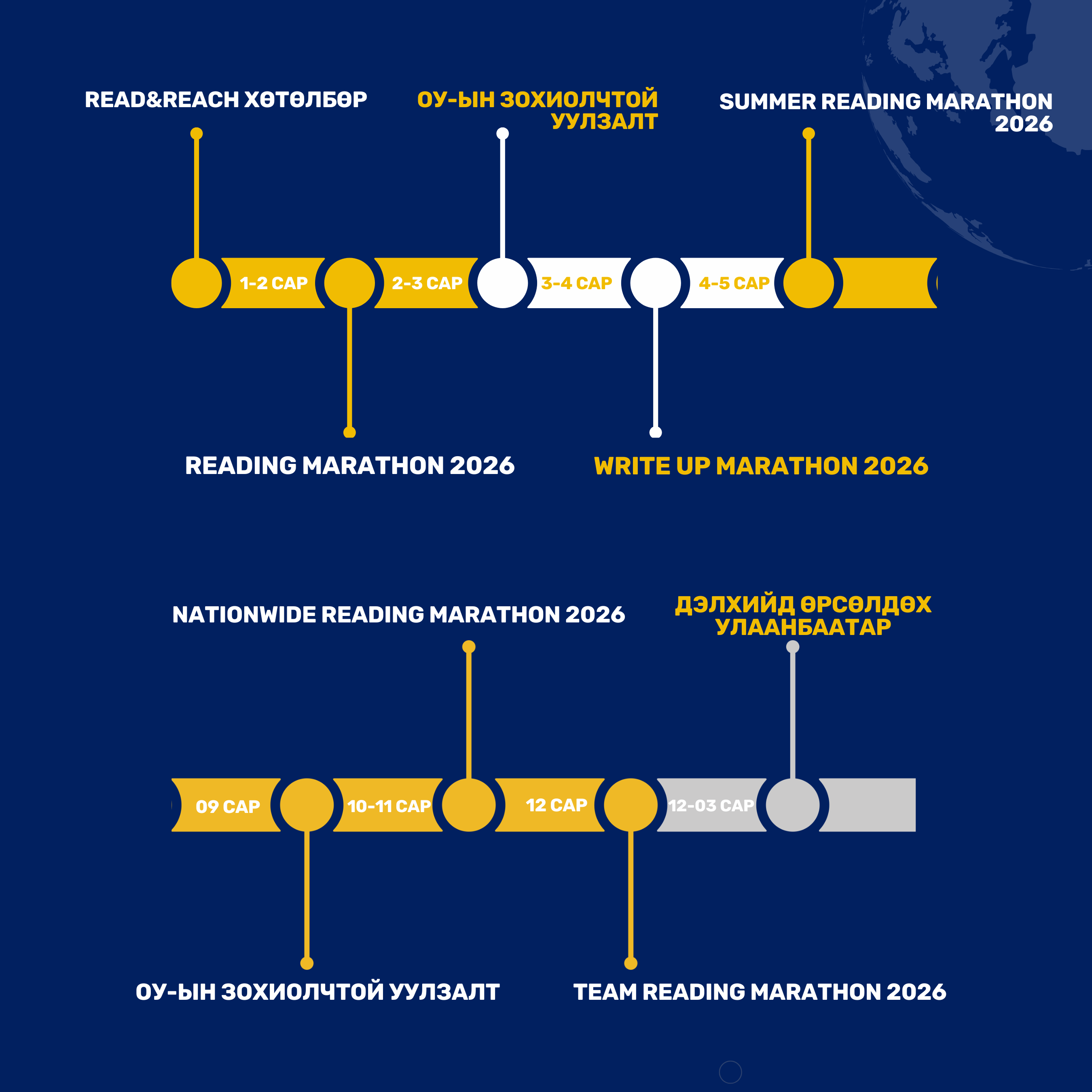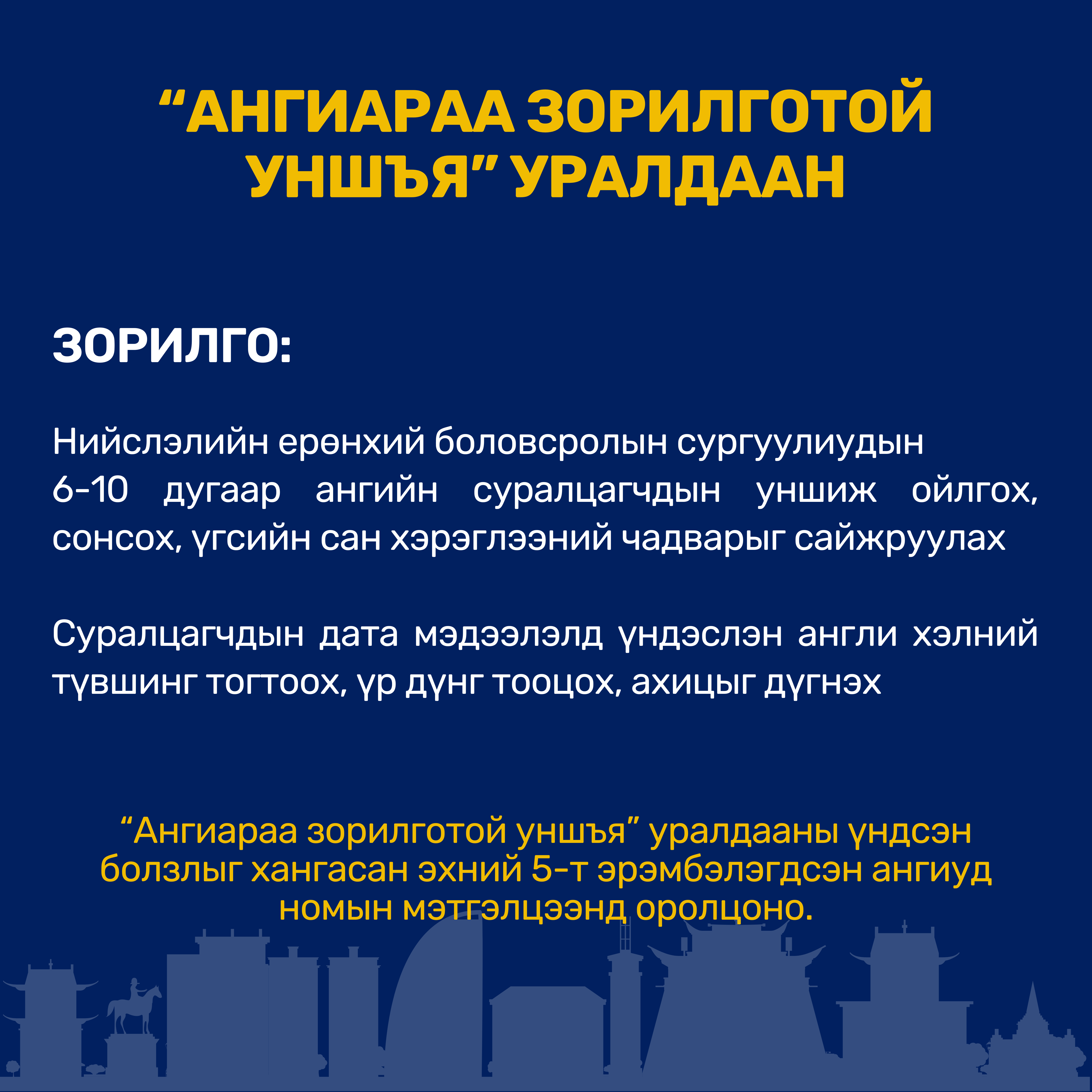 Нийслэлийн ерөнхий боловсролын сургуулийн 6-10 дугаар ангийн сурагчдынангли хэлээр уншиж, ойлгох чадварыг хөгжүүлэхэд чиглэсэн Extensive Reading буюу тогтмол унших аргачлалд сургах, улмаар олон улсын англи хэлний шалгалтын чадварыг эзэмшүүлэх, шалгалтад үр дүнтэй бэлтгэх, өөрийн удирдлагатай суралцахуйг дэмжихэд оршино.