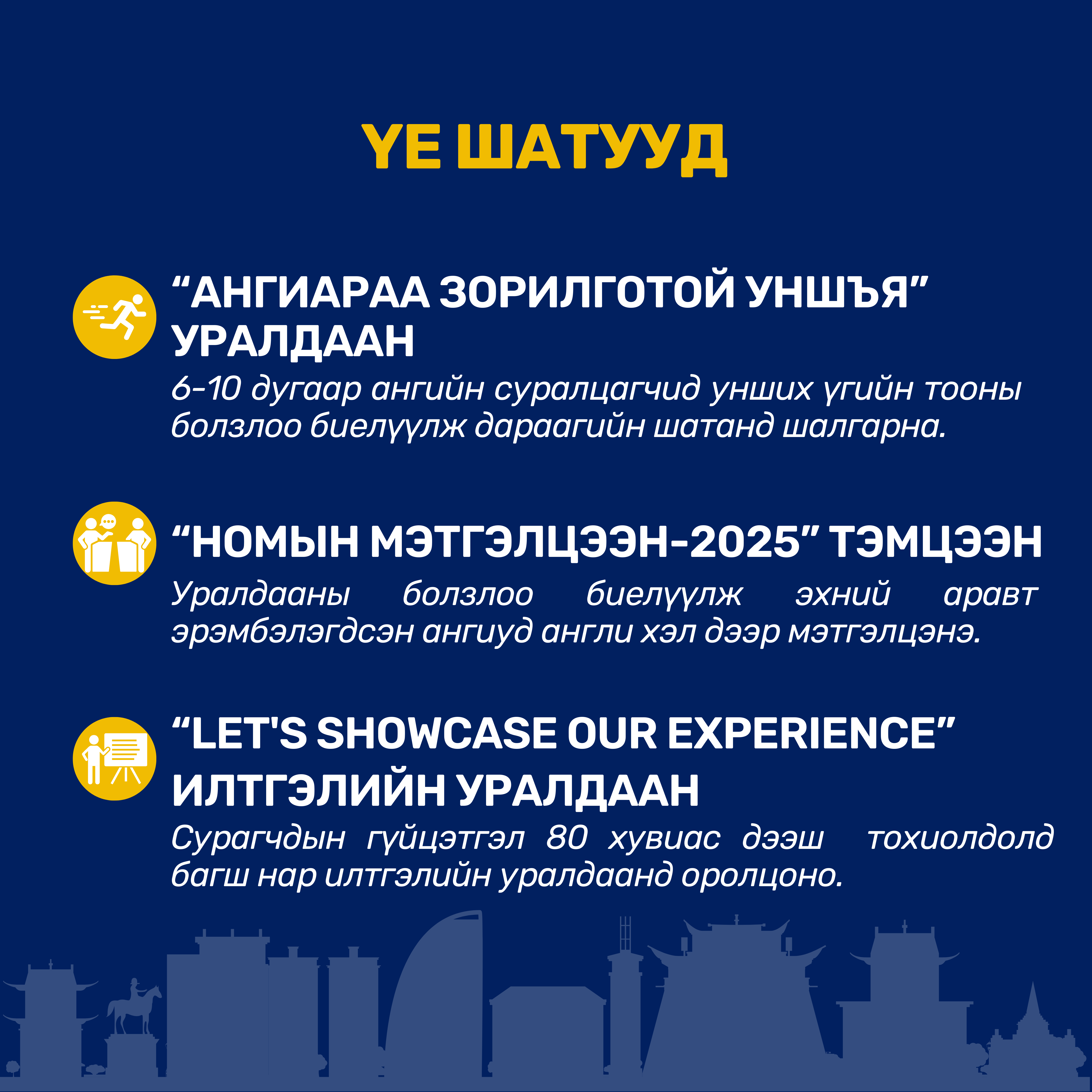 Нийслэлийн ерөнхий боловсролын сургуулийн 6-10 дугаар ангийн сурагчдын англи хэлээр уншиж, ойлгох чадварыг хөгжүүлэхэд чиглэсэн Extensive Reading буюу тогтмол унших аргачлалд сургах, улмаар олон улсын англи хэлний шалгалтын чадварыг эзэмшүүлэх, шалгалтад үр дүнтэй бэлтгэх, өөрийн удирдлагатай суралцахуйг дэмжихэд оршино.