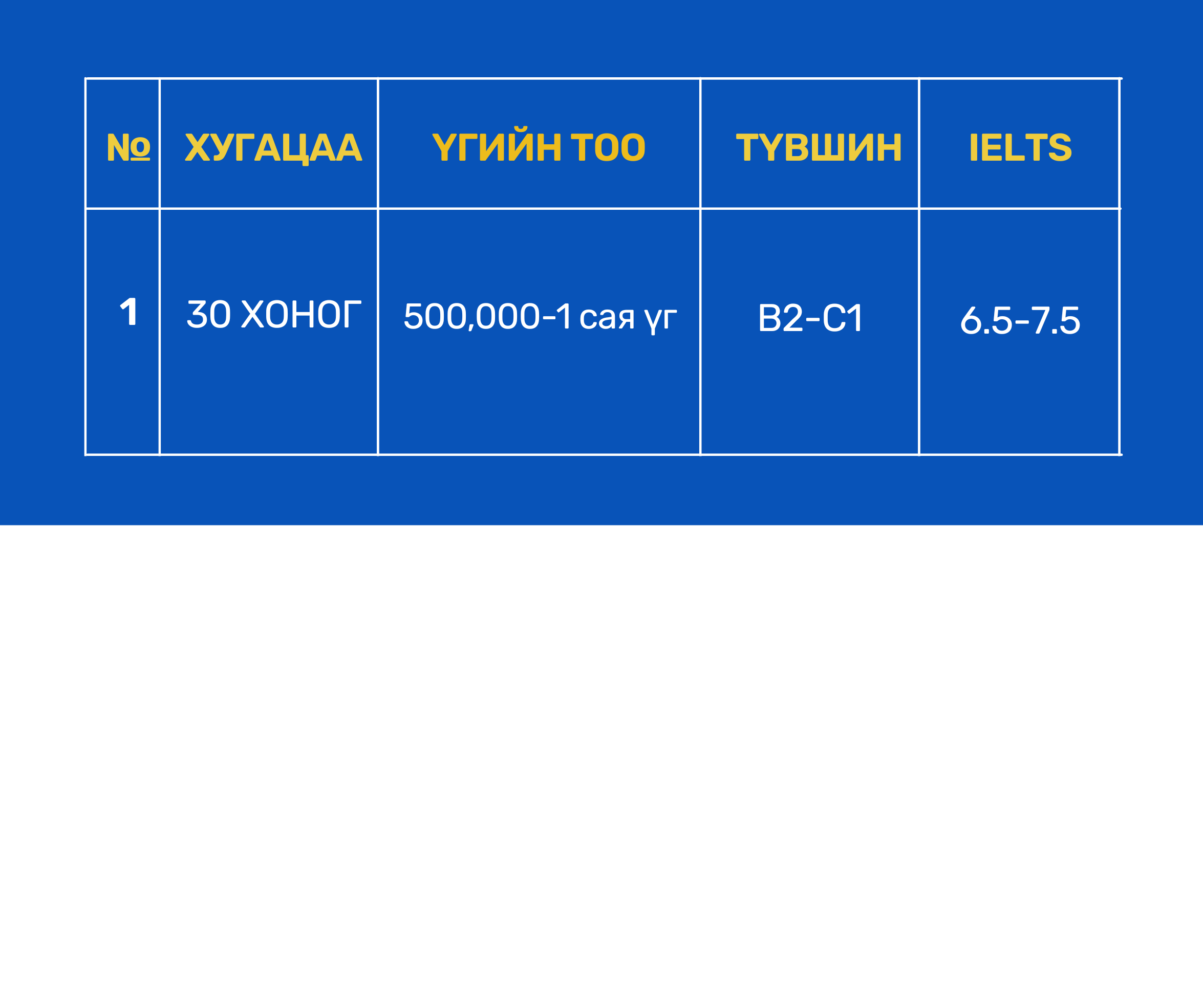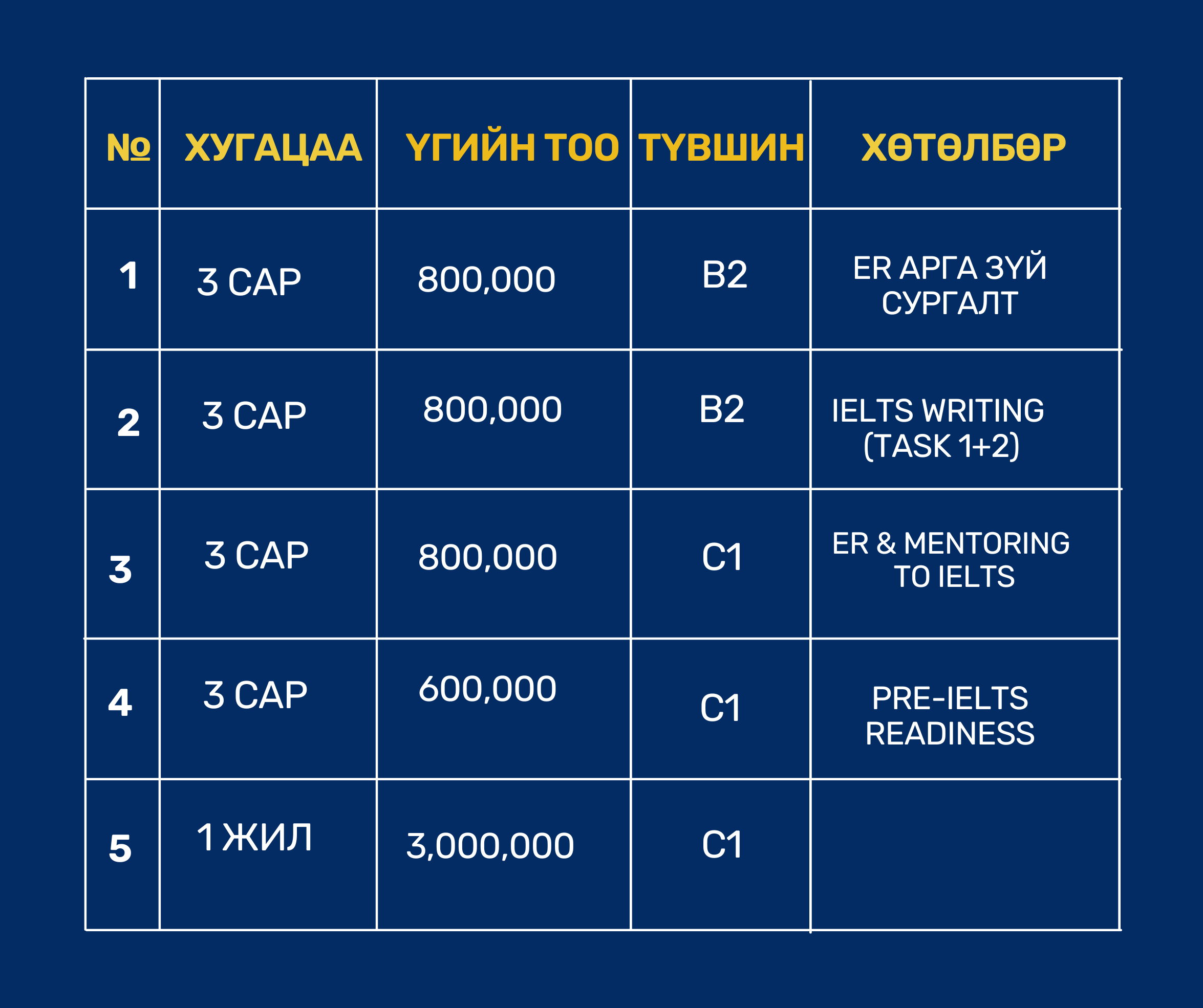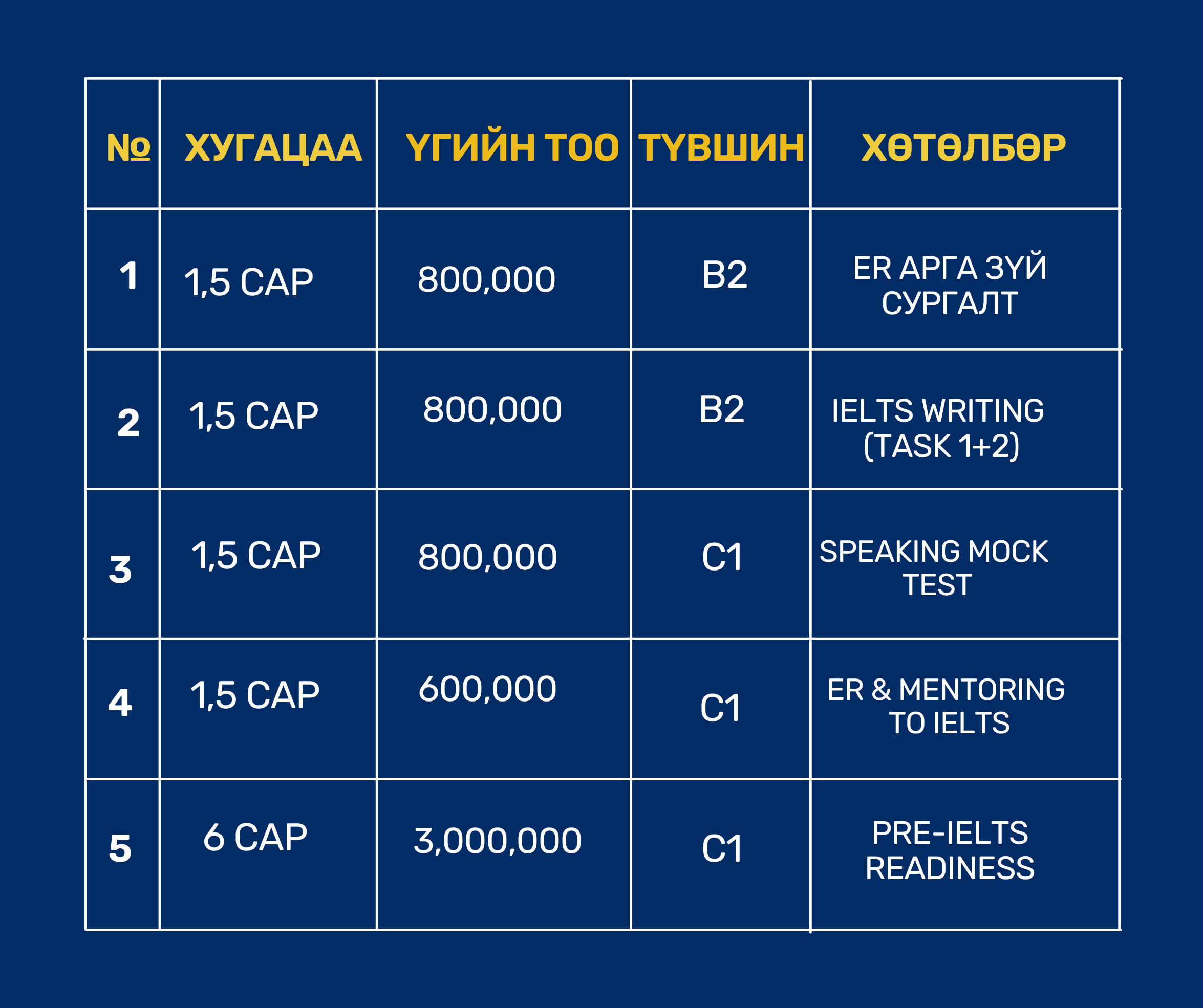 Дунд ангийн сурагчдын англи хэлний түвшинг ахиулах хөтөлбөр болон Ахлах ангийн сурагчдыг IELTS оноонд хүргэх, англи хэлний ЭЕШ-ын дундаж оноог ахиулах хөтөлбөр