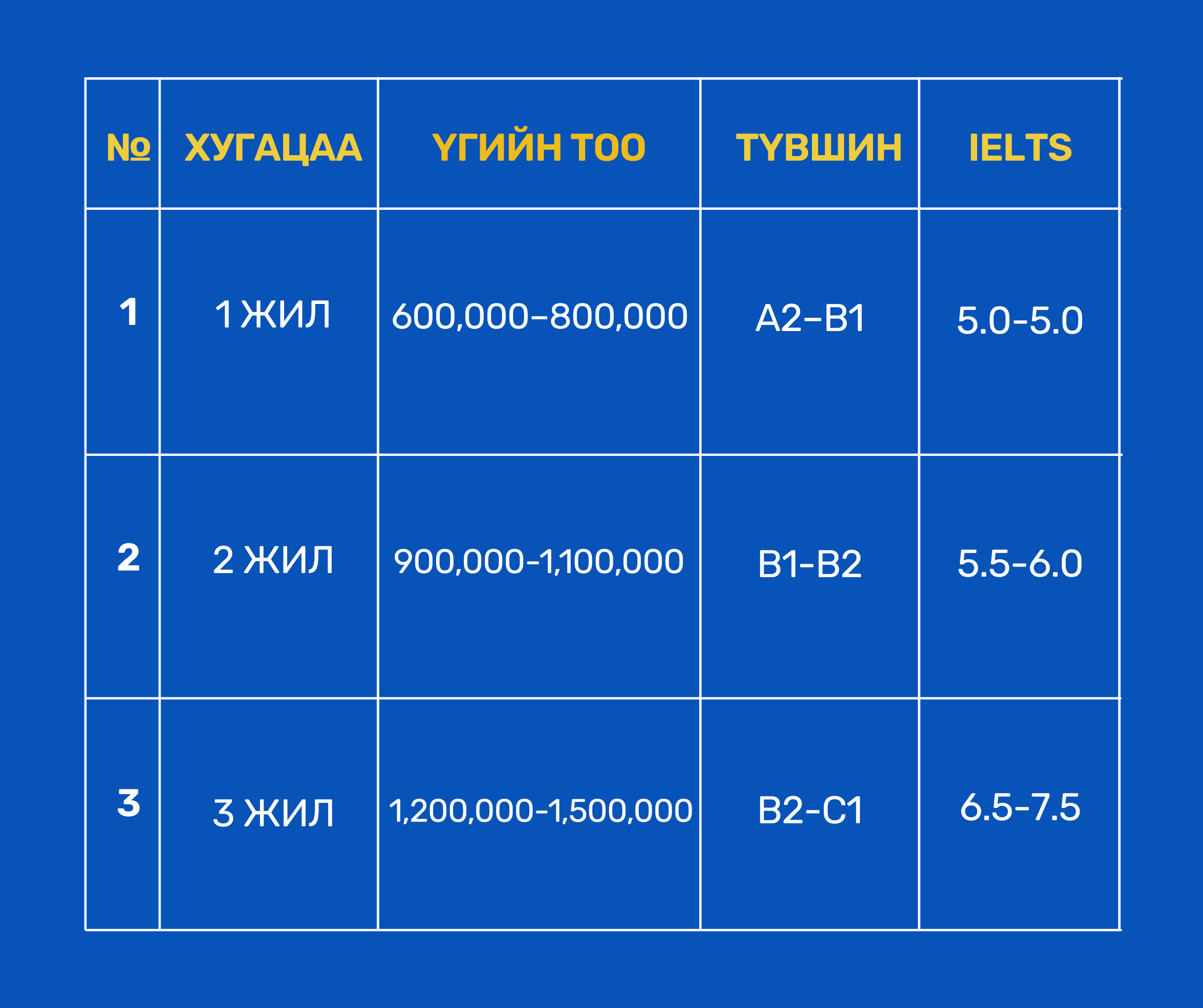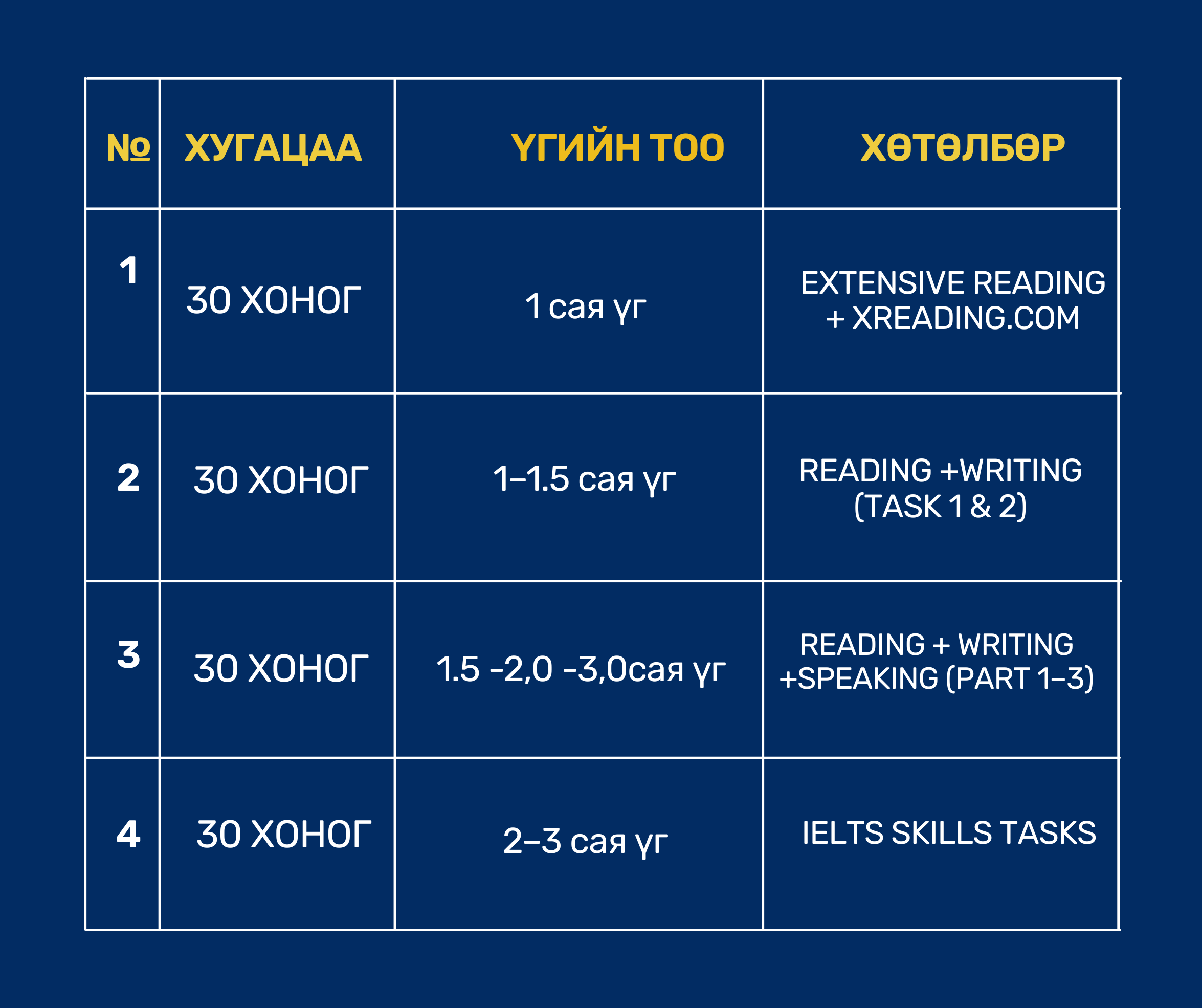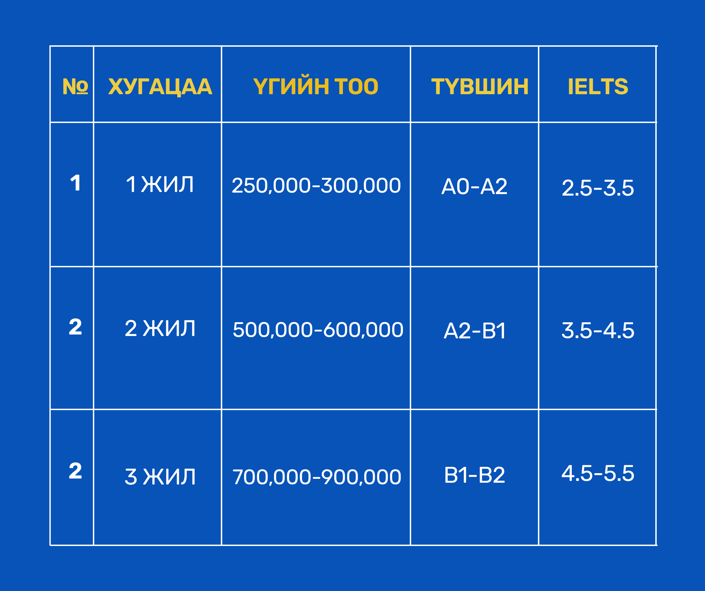 Дунд ангийн сурагчдын англи хэлний түвшинг ахиулах хөтөлбөр болон Ахлах ангийн сурагчдыг IELTS оноонд хүргэх, англи хэлний ЭЕШ-ын дундаж оноог ахиулах хөтөлбөр