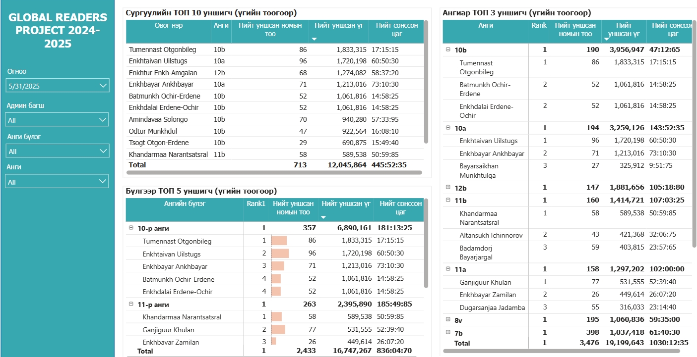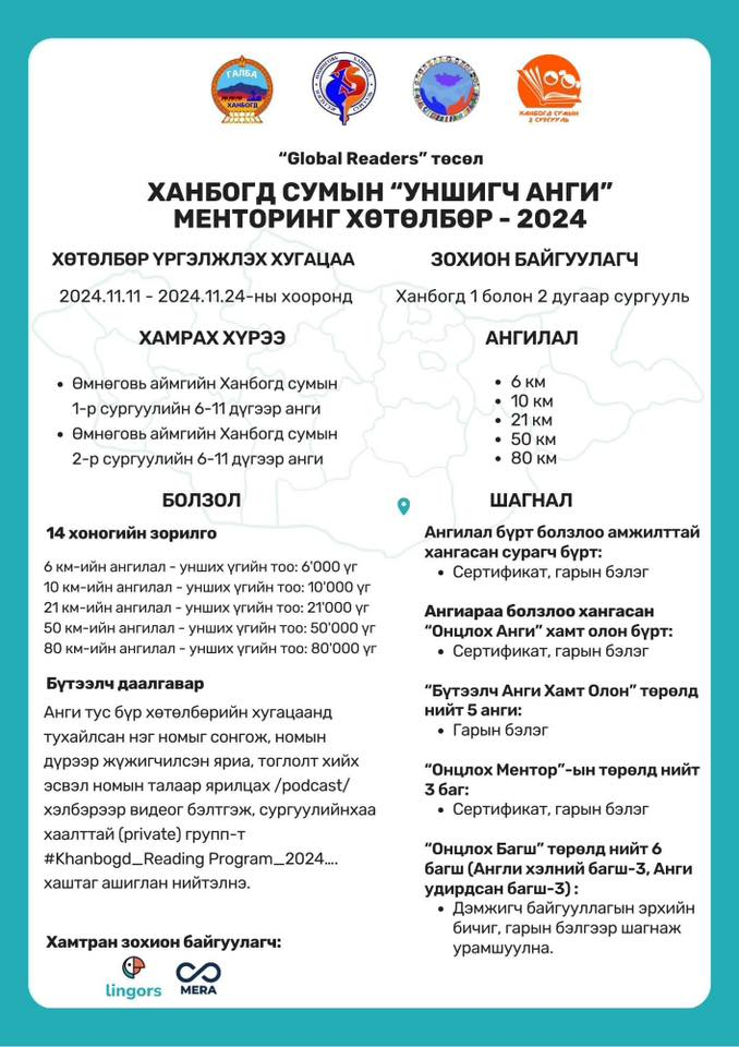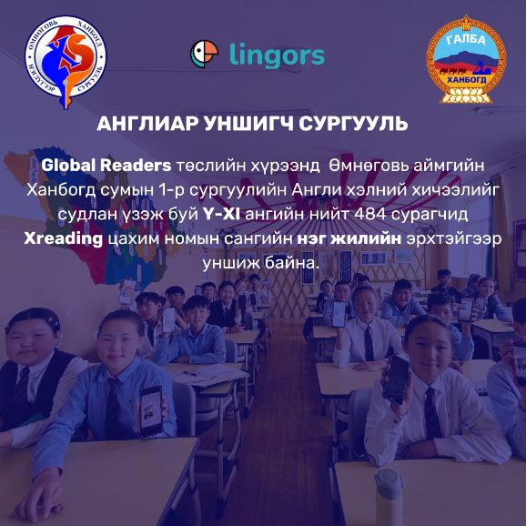 Өмнөговь аймгийн “Уншдаг Хүүхэд Хөгждөг” аяны хүрээнд XREADING цахим номын сангаар дамжуулан Extensive Reading аргачлалаар сурагчдын англи хэлний уншиж ойлгох, сонсох, бичих, ярих чадвар болон үгсийн сан нэмэгдүүлэх зорилготой #GlobalReaders төслийг Ханбогд сумын Засаг Даргын Тамгын Газрын санхүүжилтээр хэрэгжүүлж эхэллээ.