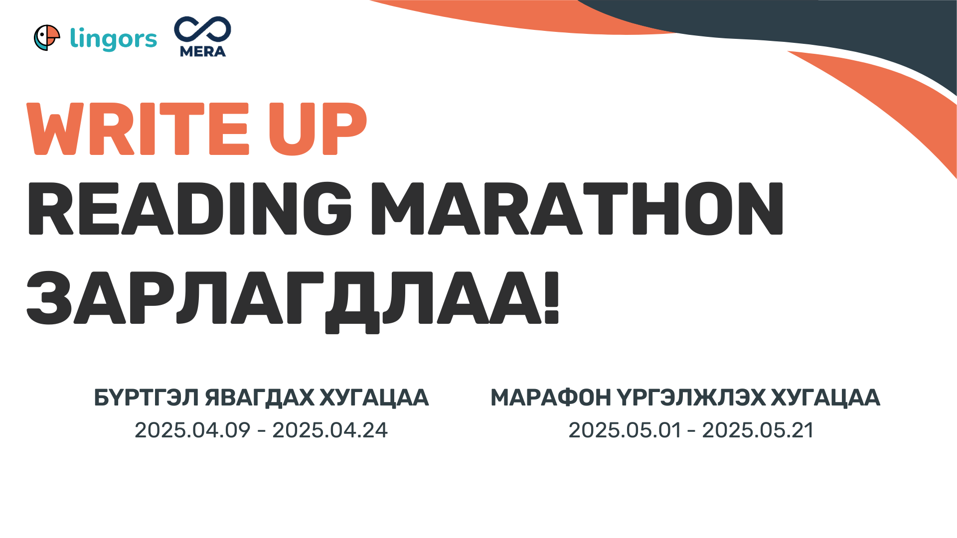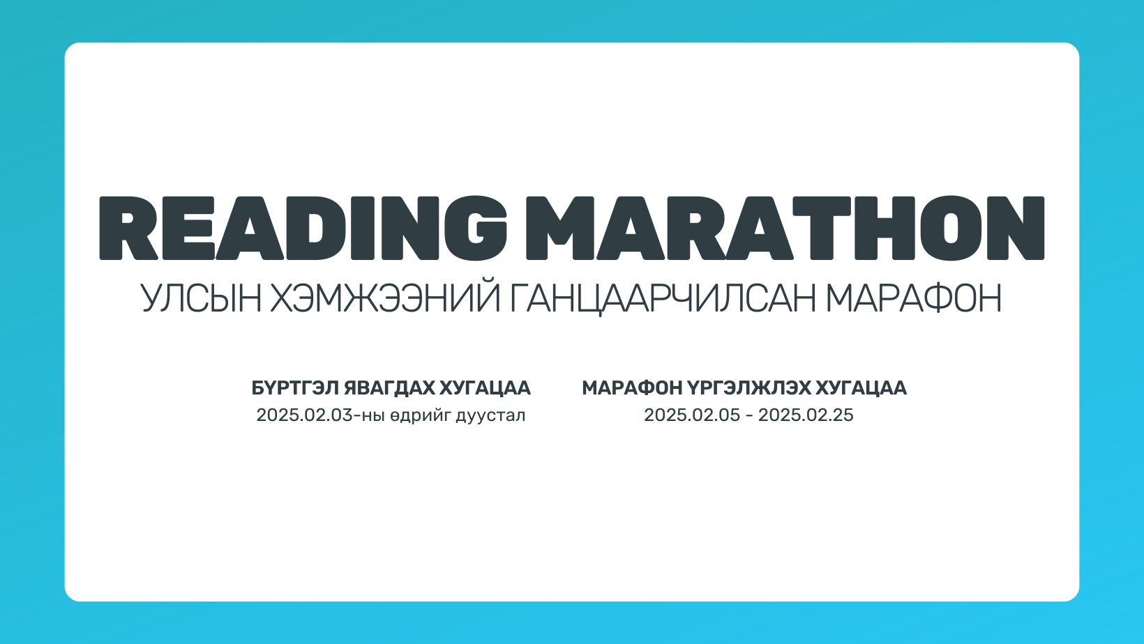 Nationwide Reading Marathon 2025 Улсын хэмжээний ганцаарчилсан марафон бөгөөд оролцогчид 21 хоногийн турш долоо хоног бүр унших болон сонсох даалгаврыг гүйцэтгэнэ. Дэлгэрэнгүй ...