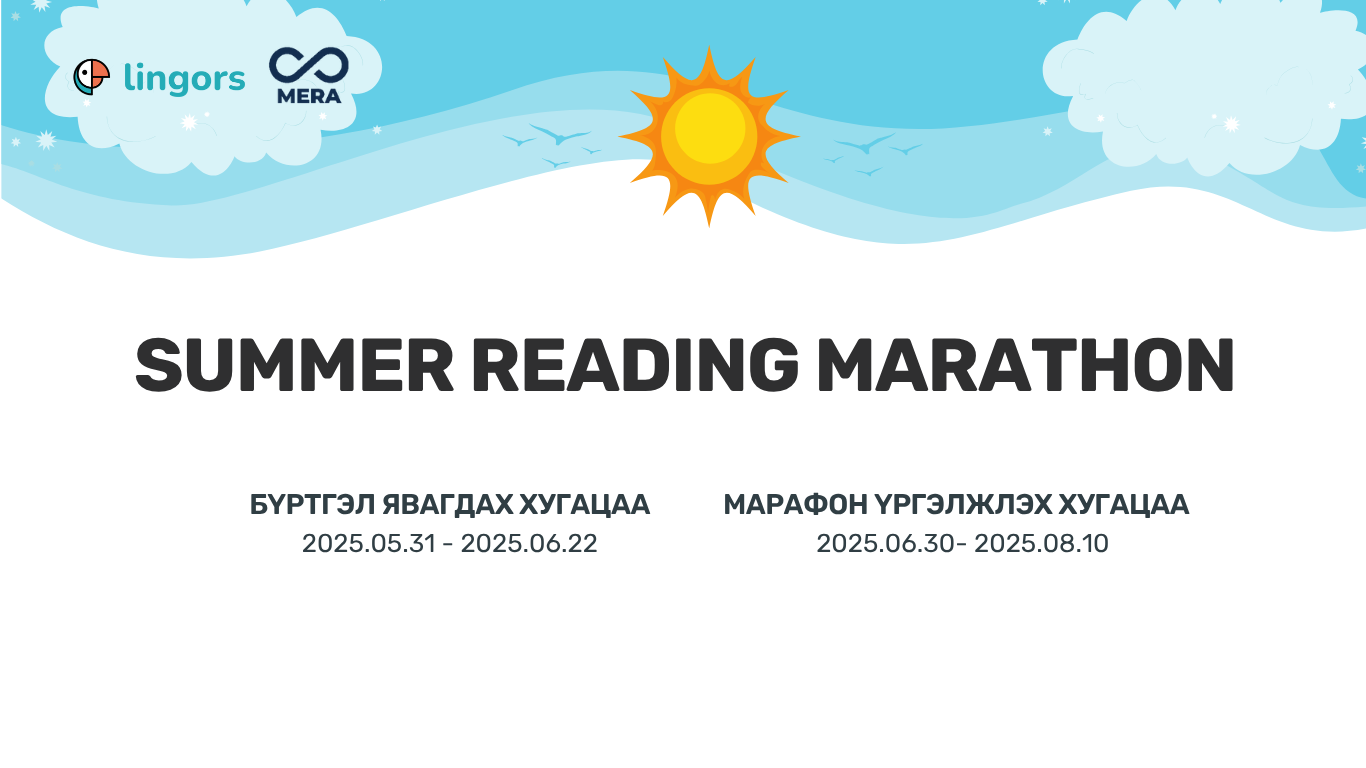 Summer Reading Marathon 2025 Зуны амралтаа үр бүтээлтэй өнгөрүүлж, унших болон сонсох болзлыг биелүүлэн оролцоно. Дэлгэрэнгүй ...