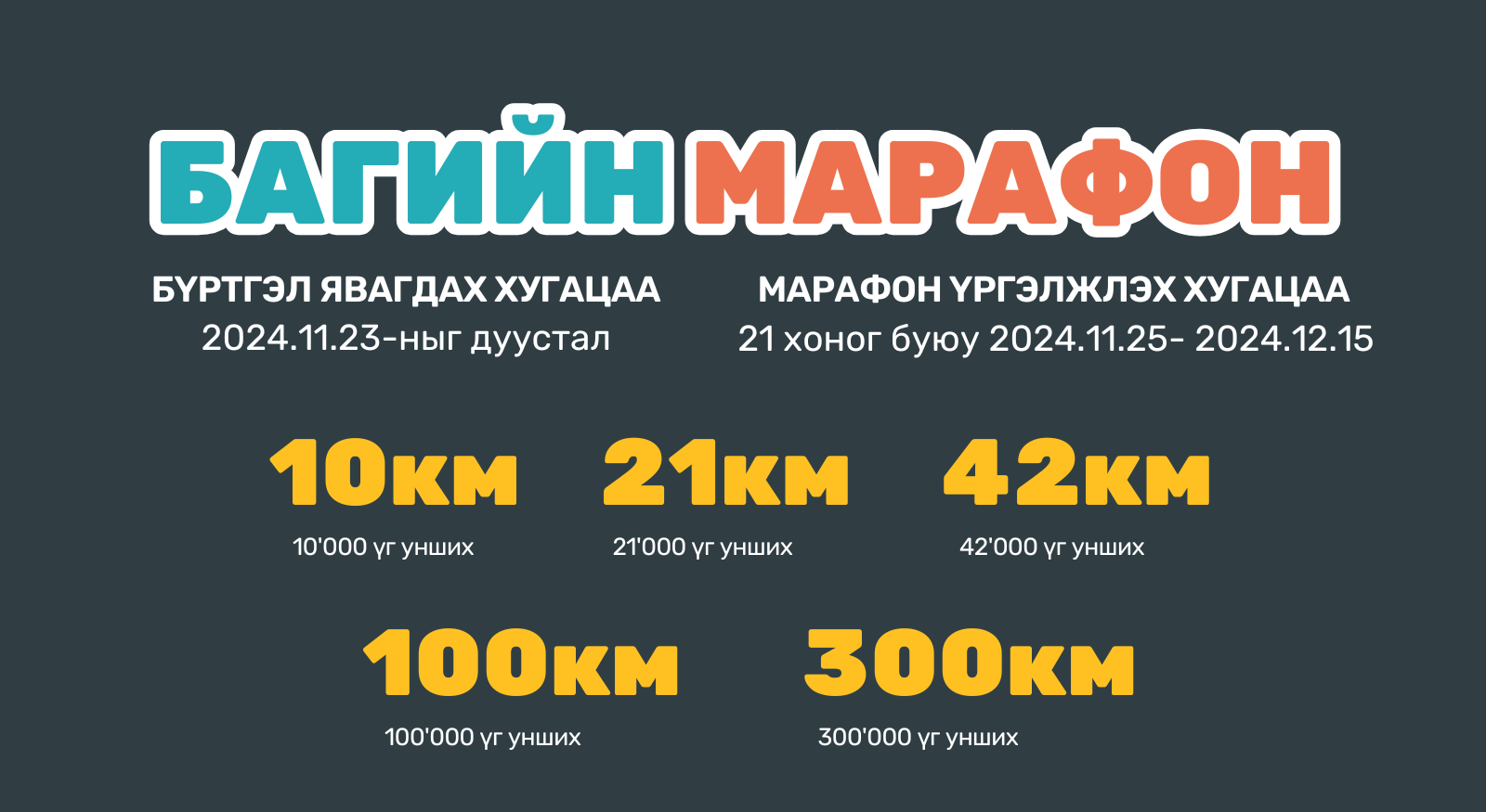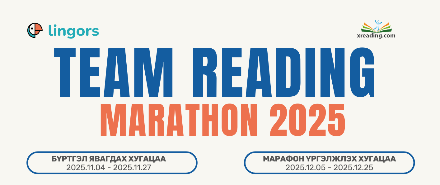 Team Reading Marathon 2024 5 гишүүнтэй баг бүрдүүлэн багийн гишүүн тус бүр долоо хоног бүрийн унших болон сонсох болзлыг биелүүлнэ. Дэлгэрэнгүй ...