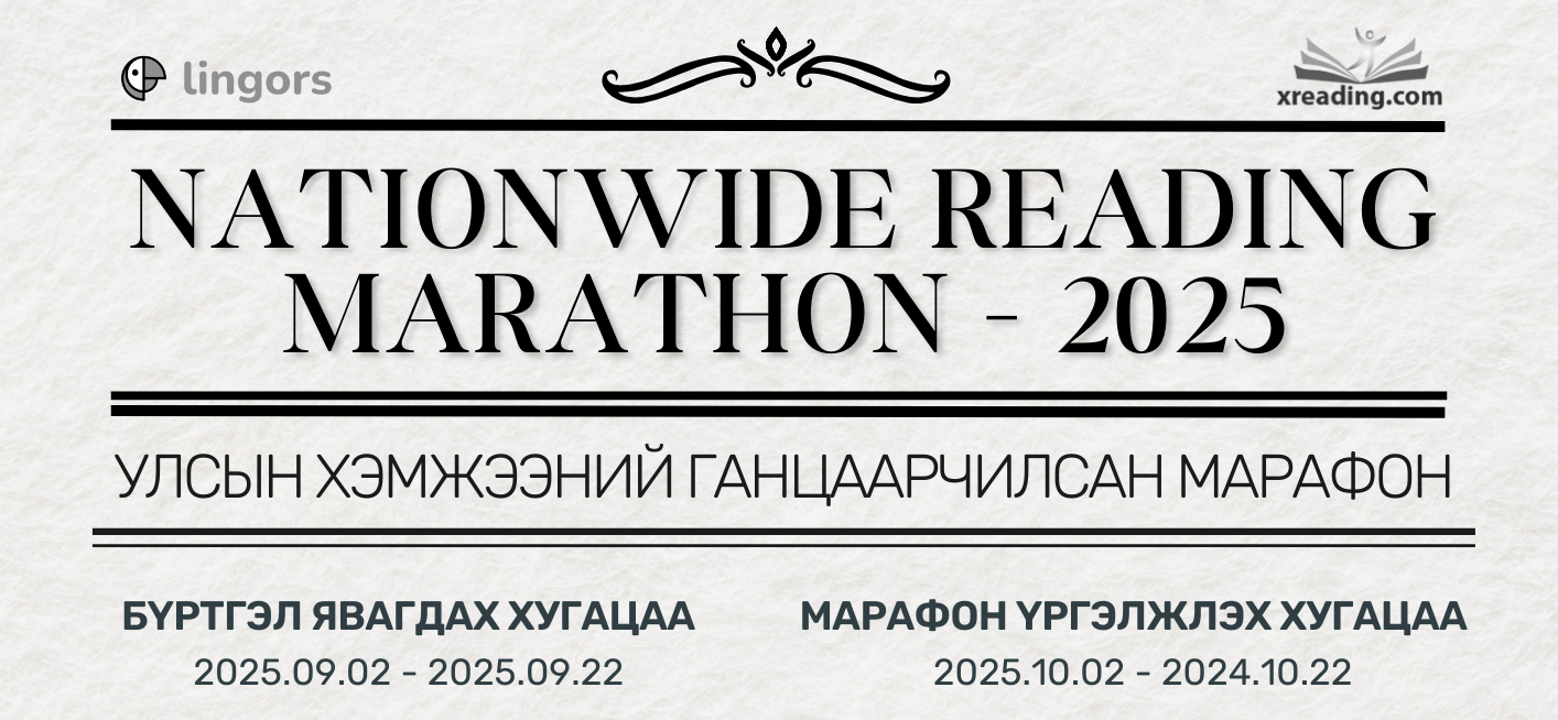 Туршлагаа хуваалцаж, бусдыг дагуулцгаая! 🌍📖#Nationwide_Reading_Marathon_2025 хаштагийг ашиглан Extensive Readers in Mongolian групп дээр сайн дураараа хуваалцах боломжтой.
