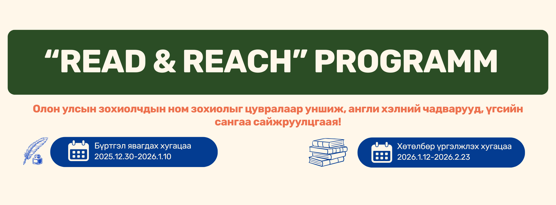 Англи хэл дээр түвшиндээ тохирсон ном уншихын сацуу Англи хэл сурах арга барил, зөвлөгөө бүхий “English Powered” цуврал номыг эх хэл буюу Монгол хэл дээрээ уншиж, хөтөлбөрийн хугацаанд уншсан номынхоо зохиолчидтой цуврал уулзалтад хамрагдаж англи хэлний унших, сонсох, бичих, ярих чадвар болон үгсийн сангаа сайжруулахад чиглэнэ.