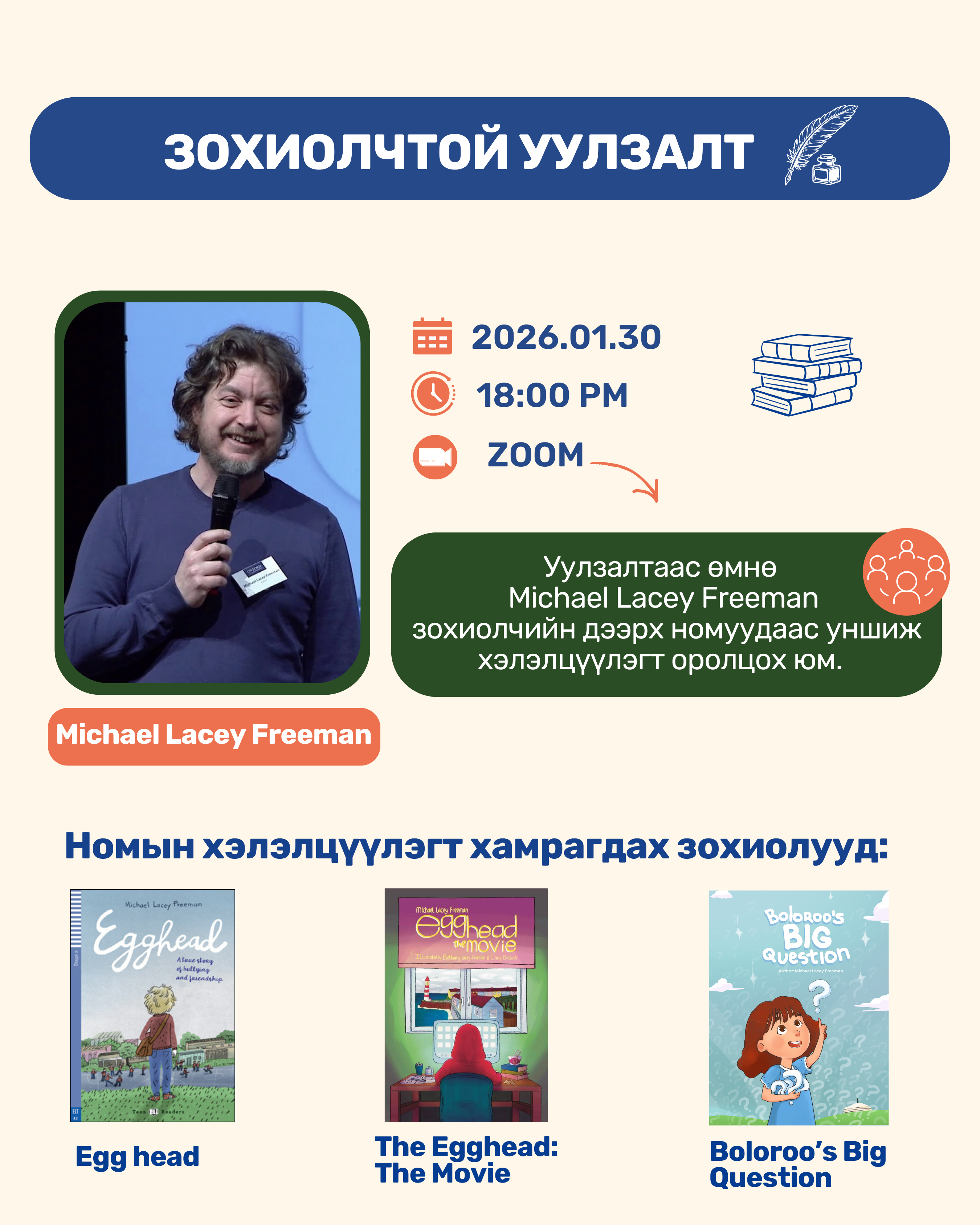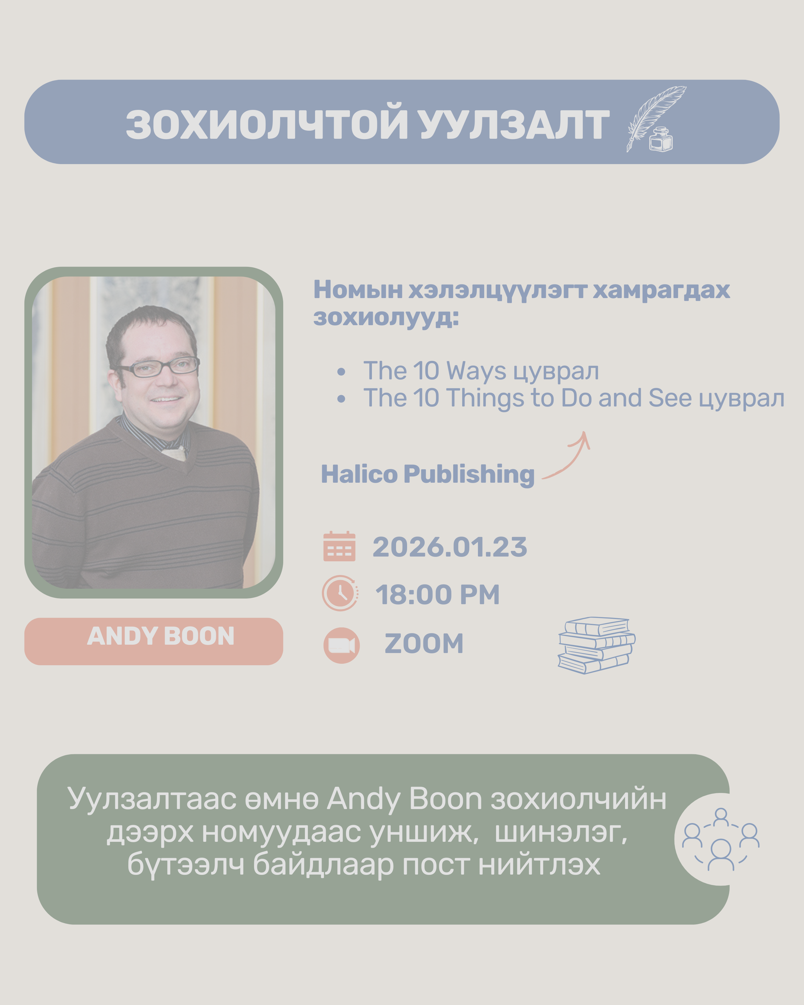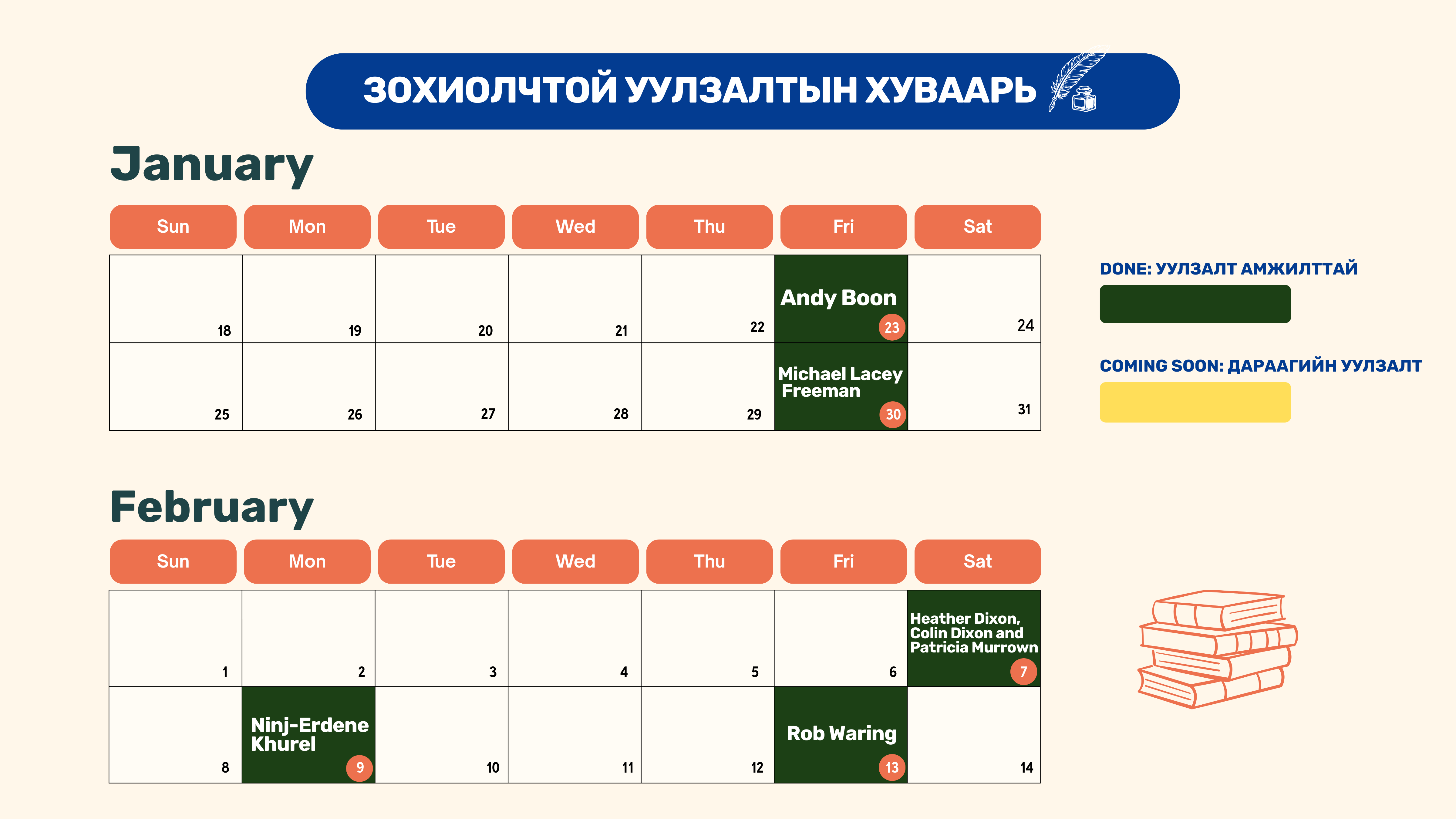 Номын зохиолчидтой уулзалтад оролцож, номын агуулгын талаар ярилцаж хэлэлцүүлэгт оролцоно.