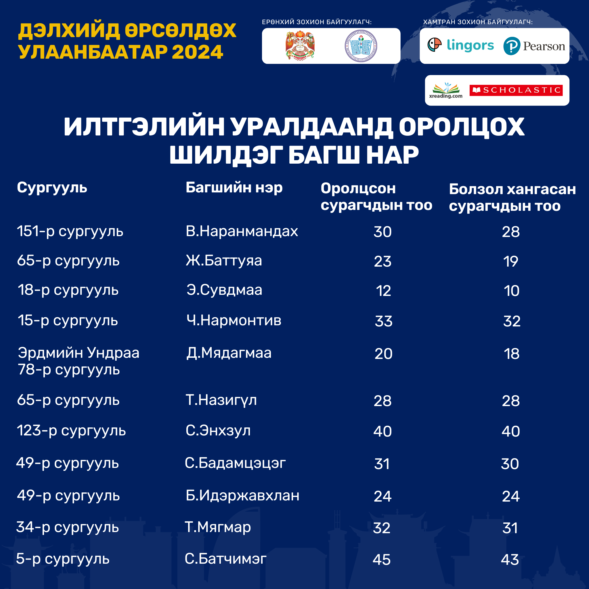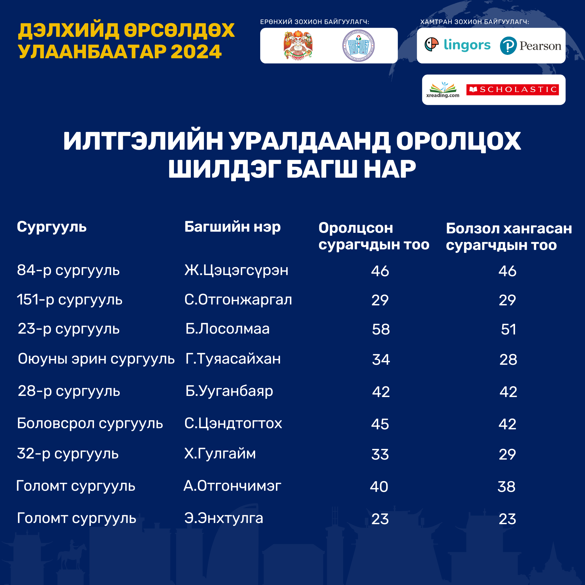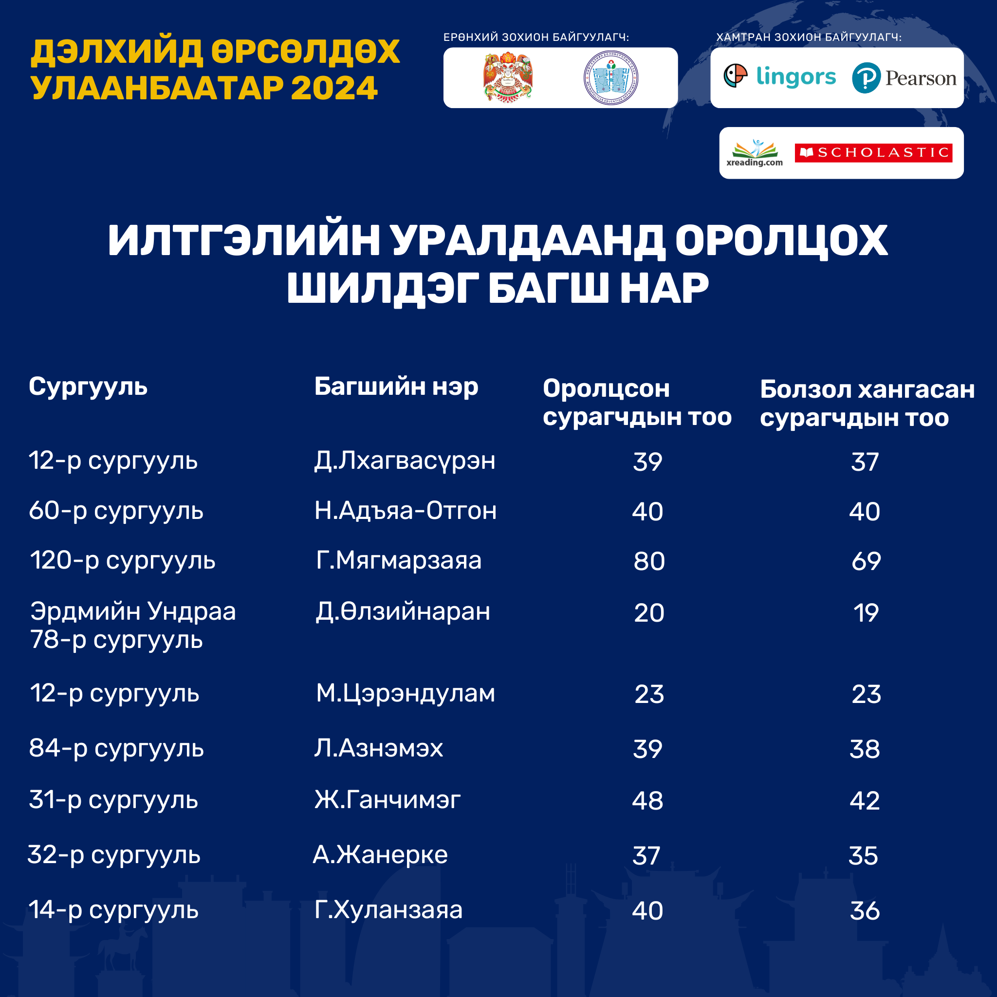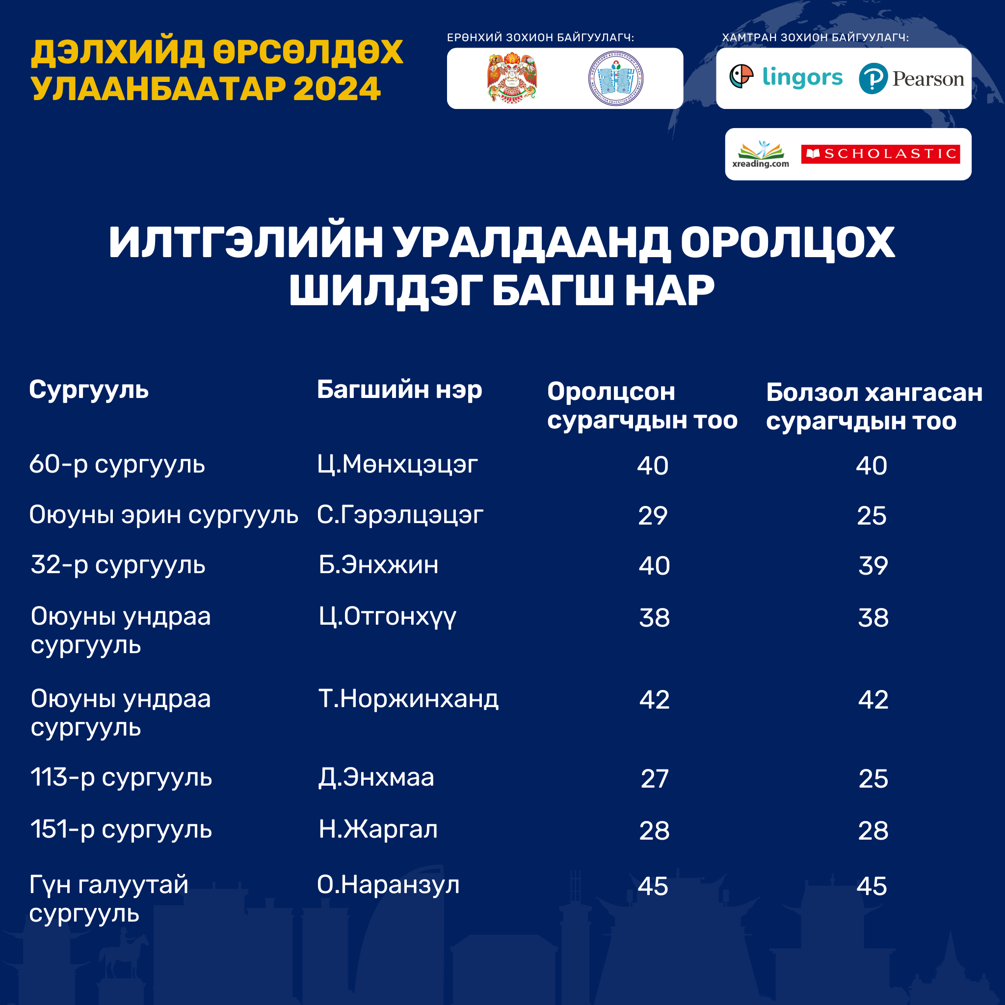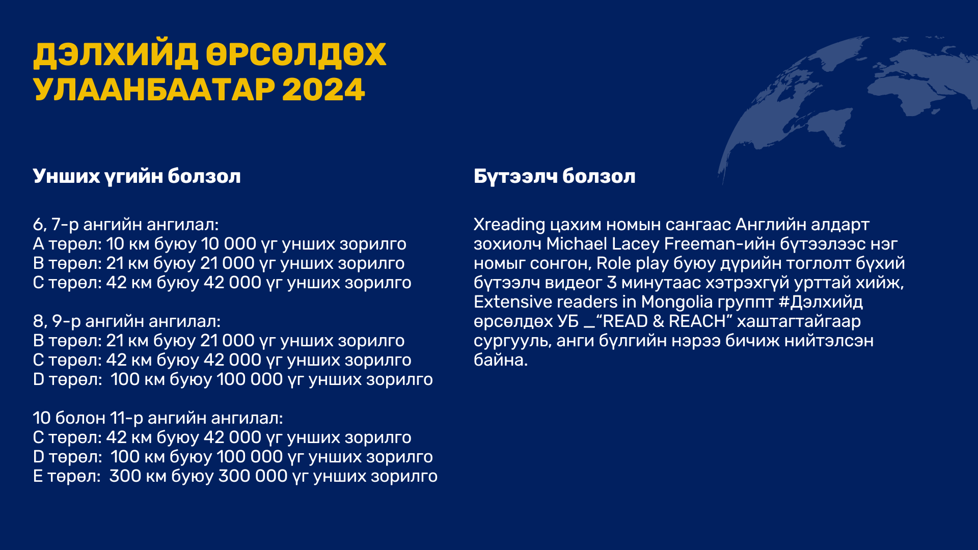 Нийслэлийн төрийн өмчийн ерөнхий боловсролын сургуулийн 6-11 дүгээр ангийн сурагчдын англи хэлээр уншиж, ойлгох чадварыг хөгжүүлэхэд чиглэсэн Extensive Reading буюу тогтмол унших аргачлалд сургах, улмаар олон улсын англи хэлний шалгалтын чадварыг эзэмшүүлэх, шалгалтад үр дүнтэй бэлтгэх, өөрийн удирдлагатай суралцахуйг дэмжихэд оршино.